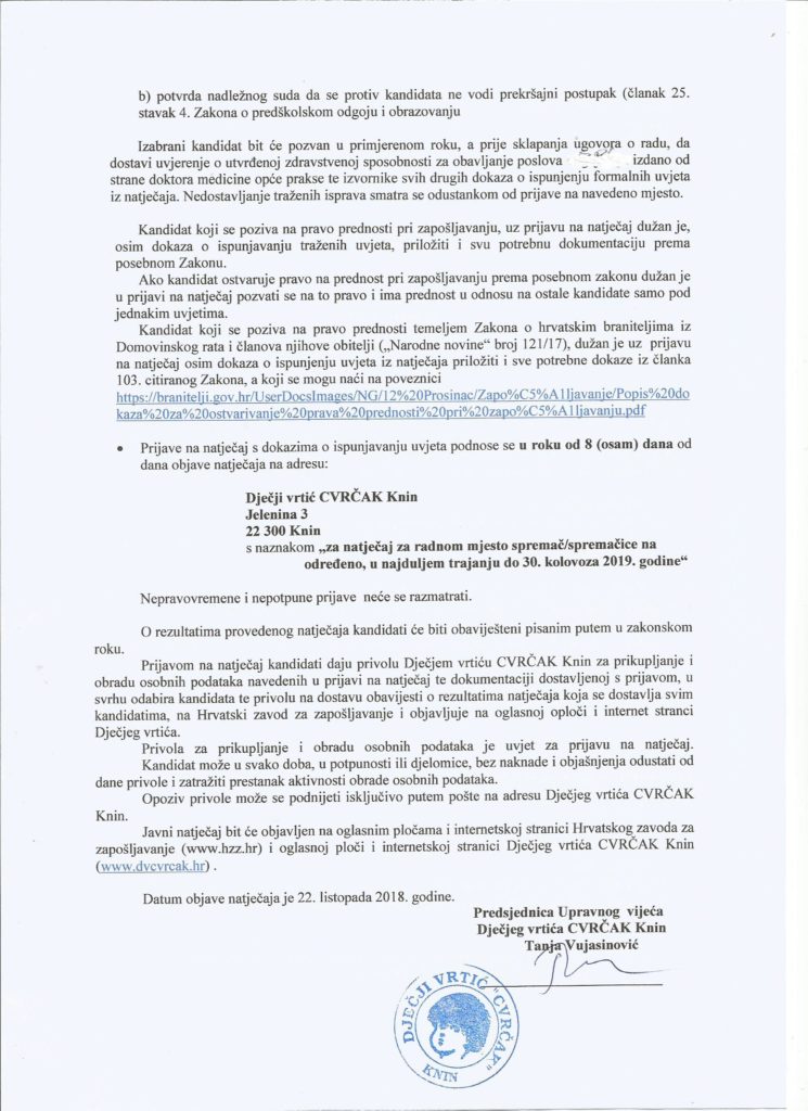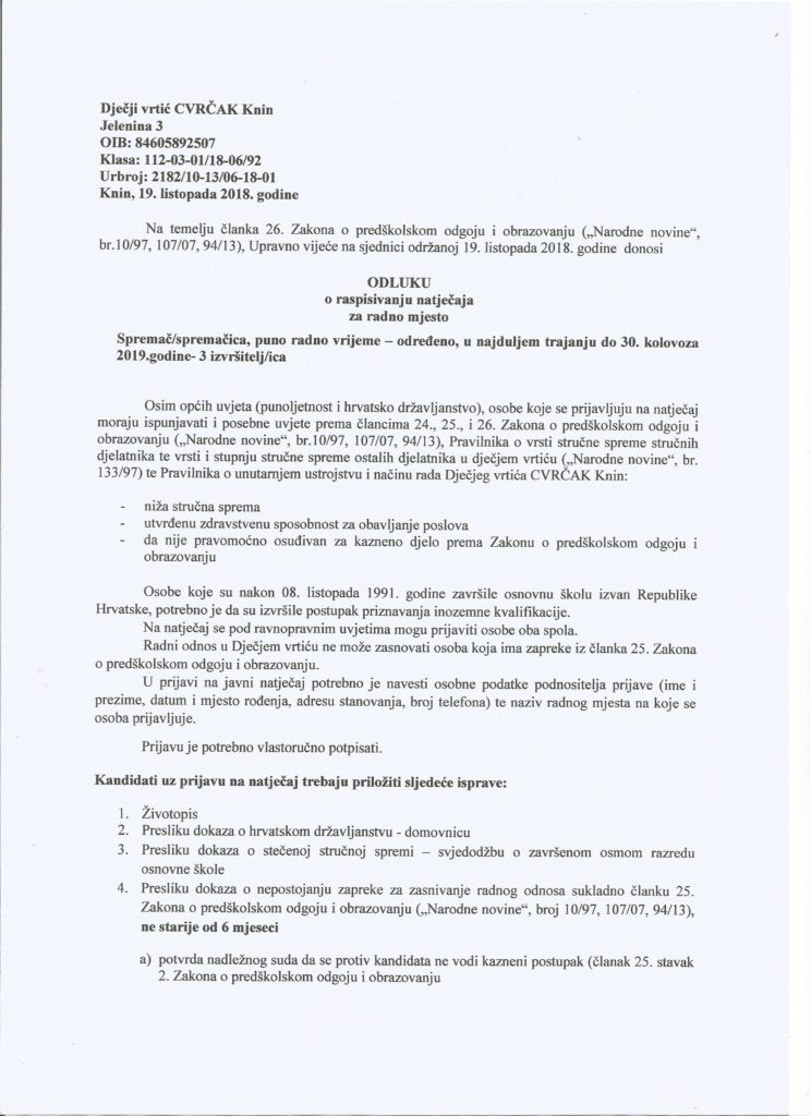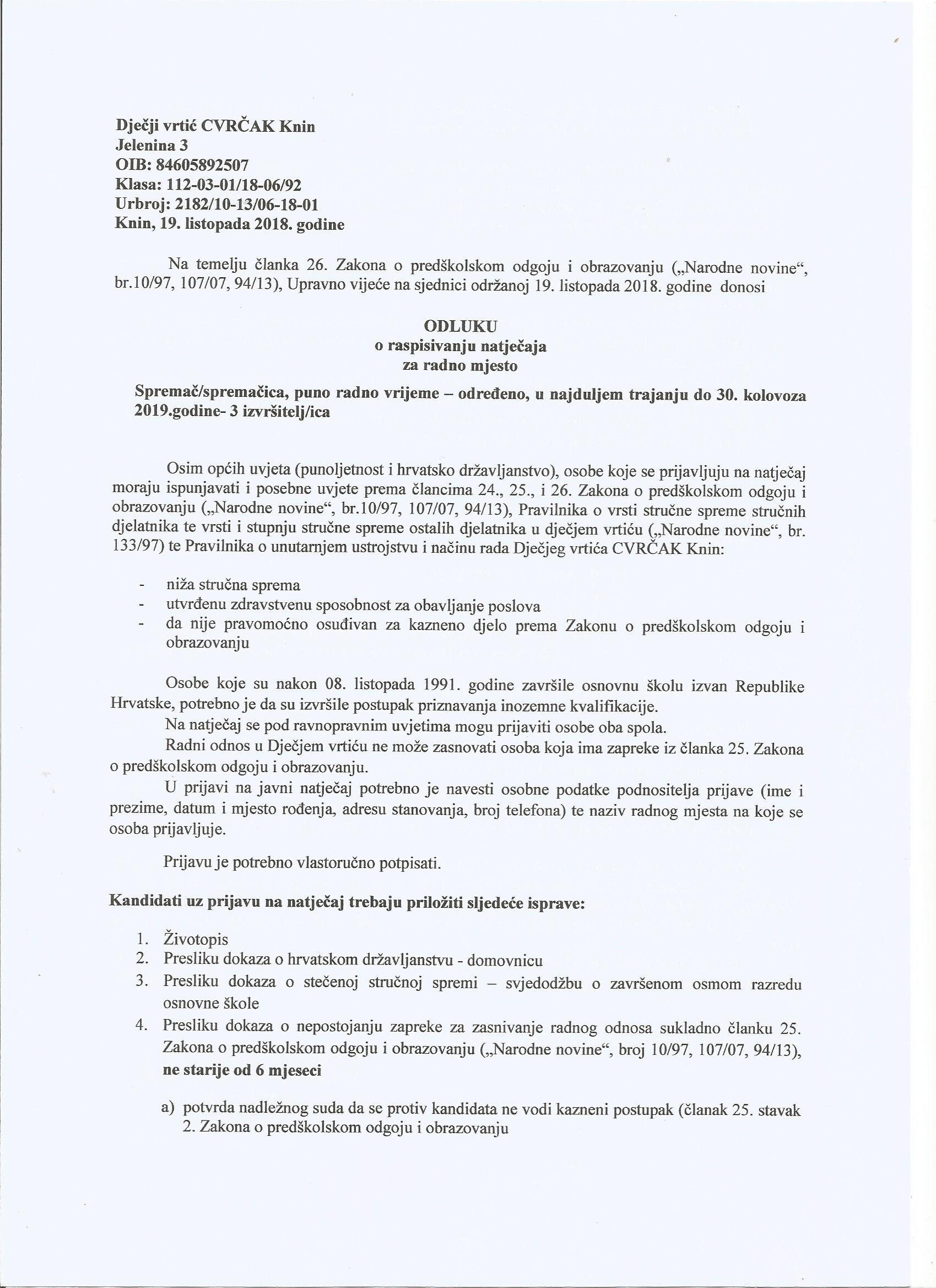 Spremač/spremačica, puno radno vrijeme – određeno, u najduljem trajanju do 30. kolovoza 2019. godine – 3 izvršitelj/ica.