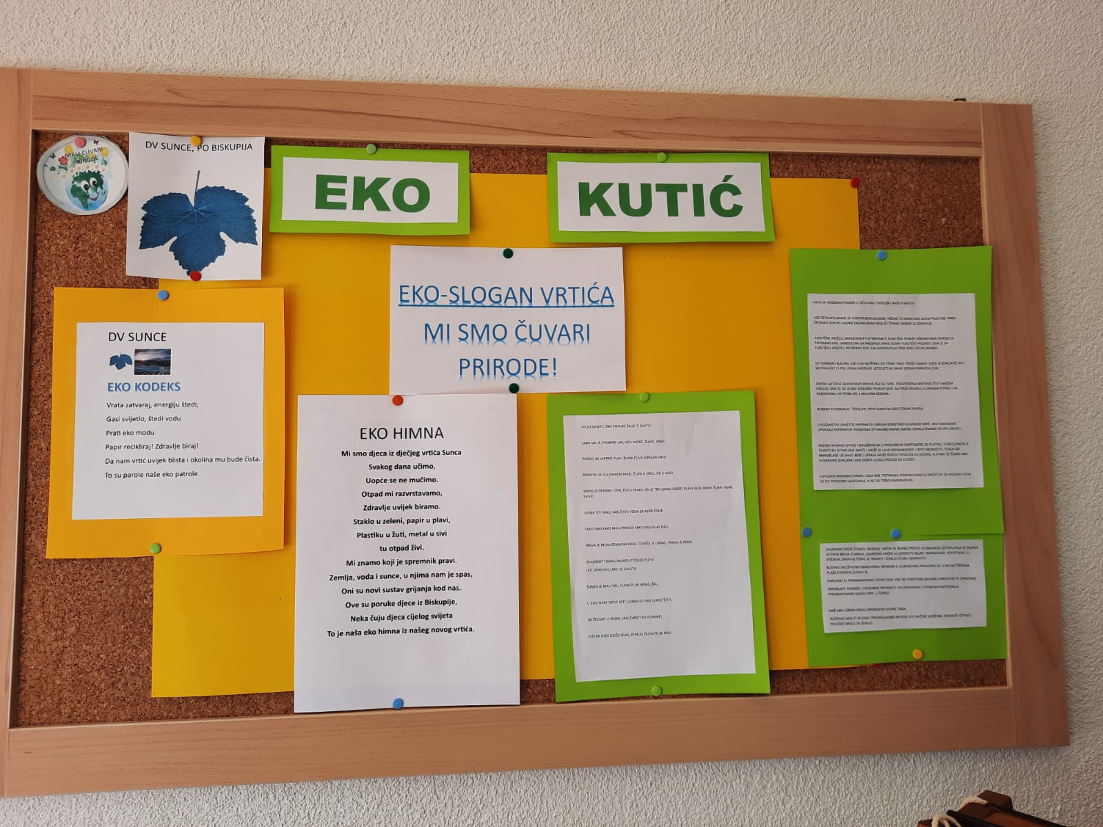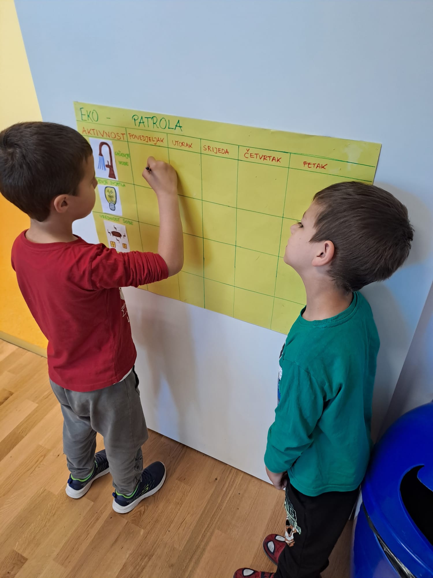 Djeca su od samog početka sudjelovala u kreiranju eko – himne, eko – slogana. Eko – patrola je svakodnevno provodila nadzor u sobi i dvorištu – štednja vode, urednosti sobe i okoliša, pravilno razvrstavanje otpada. U sve aktivnosti uključeni su domar i pomoćnica – pomoć pri sadnji, košenju trave i zalijevanju sadnica.