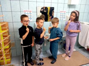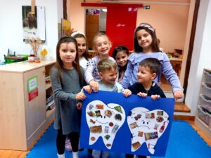 Kroz aktivnost „Higijena zuba“ zdravstvena voditeljica je upoznala djecu o važnosti oralnog zdravlja. Cilj provedene aktivnosti je istražiti ulogu zuba u životu, koje su sve mogućnosti u prevenciji karijesa, tko i što nam pomaže u očuvanju zdravih zuba.